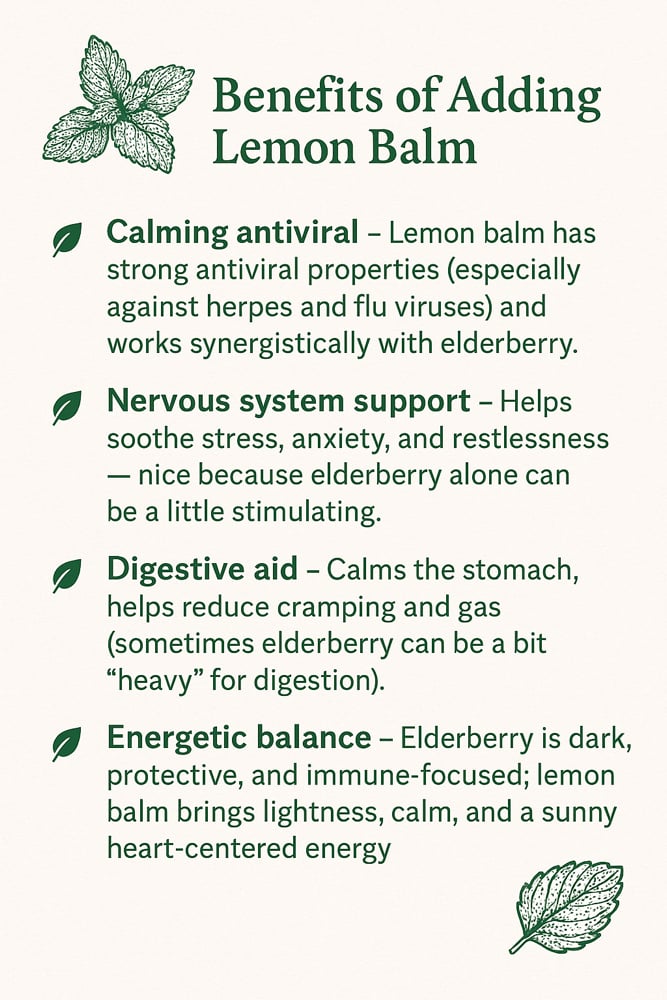 Handcrafted in small batches, our elderberry syrup brings together the deep, immune-strengthening power of organic elderberries with the bright, soothing touch of fresh lemon balm harvested straight from our garden.